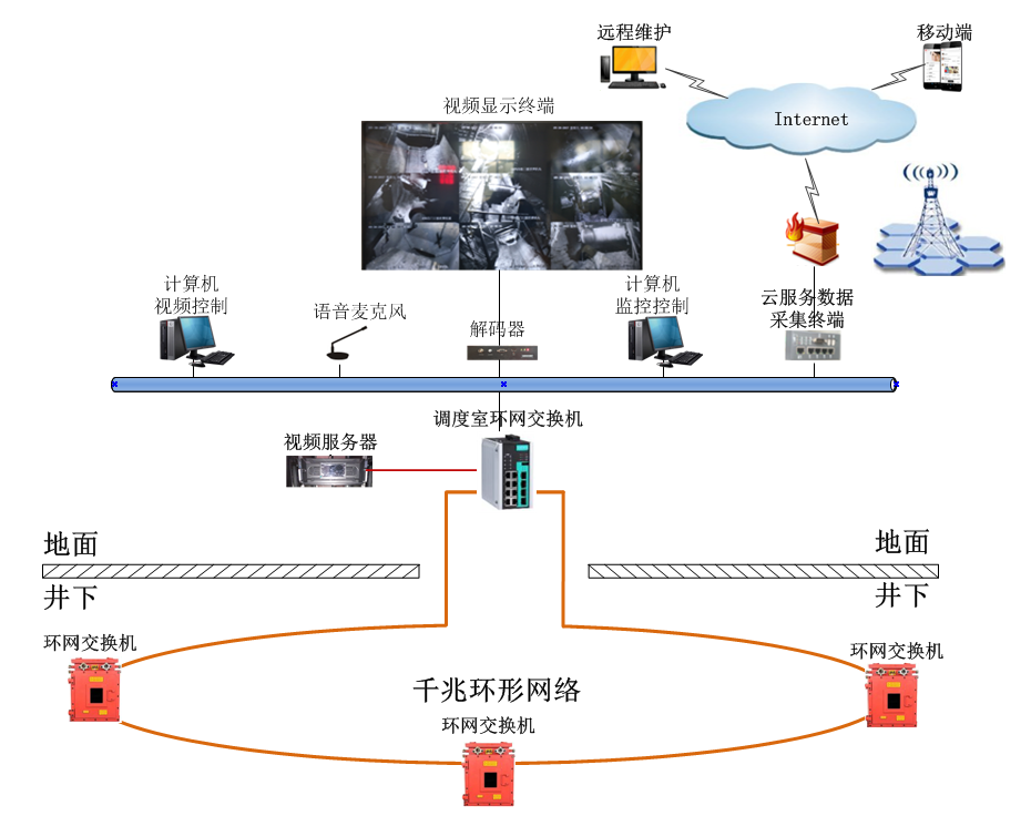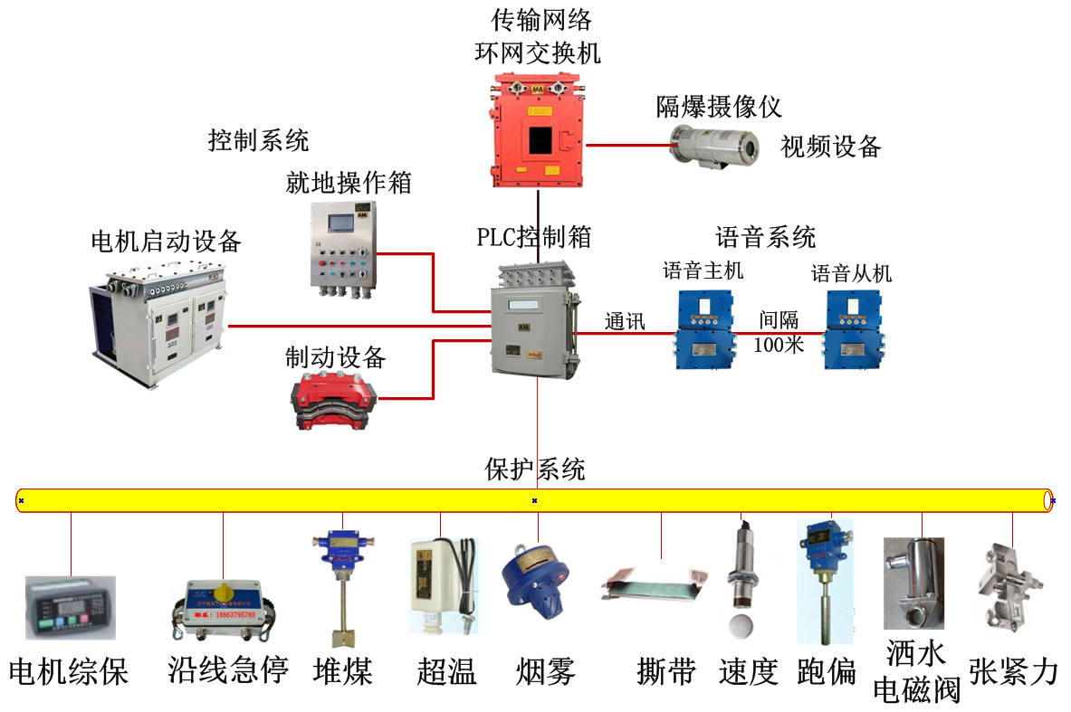 本系統主要由PLC控制、視頻監控、皮帶綜合保護、預警通話、運行參數監測與數據分析、傳輸網絡等模塊組成。PLC控制系統的下位機選用西門子S7系列產品,皮帶保護系統配備堆煤保護、沿線急停保護、超溫保護、煙霧保護、縱撕保護、速度保護、跑偏保護、張緊力下降保護、超溫灑水等9大保護,同時具備電機電流、電機溫度、電機振動、煤倉倉位檢測;語音系統配置我公司自主研發的KXH127型數字語音機,具備開車預警、故障語音提示、語音對講功能;電視監控系統中的礦用攝像儀采用??蹈咔鍣C芯,集控室視頻設備以海康品牌為主體。整個系統集“控”、“視”、“聽”為一體。圖a、圖b為本系統構架示意圖。