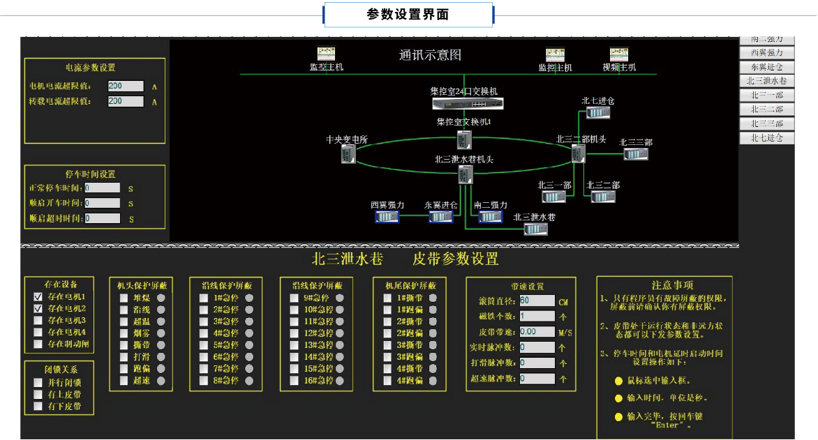 (2)集控室當皮帶開車時上位機給出聲音提示“XXX皮帶啟動”。當保護動作時提示“XXX保護動作”,電流超限、倉位超限均給出相應提示。