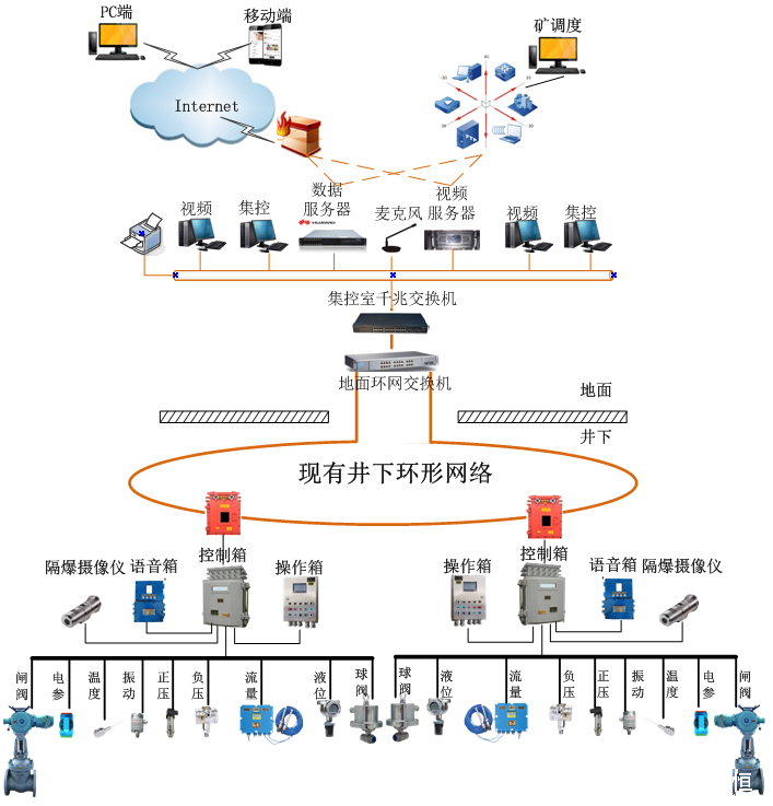 PLC控制系統配置的傳感器:射流負壓、出口壓力、電機溫度、電機振動、水倉液位、閥門到位、電機智能綜保裝置。下圖是系統構架圖。