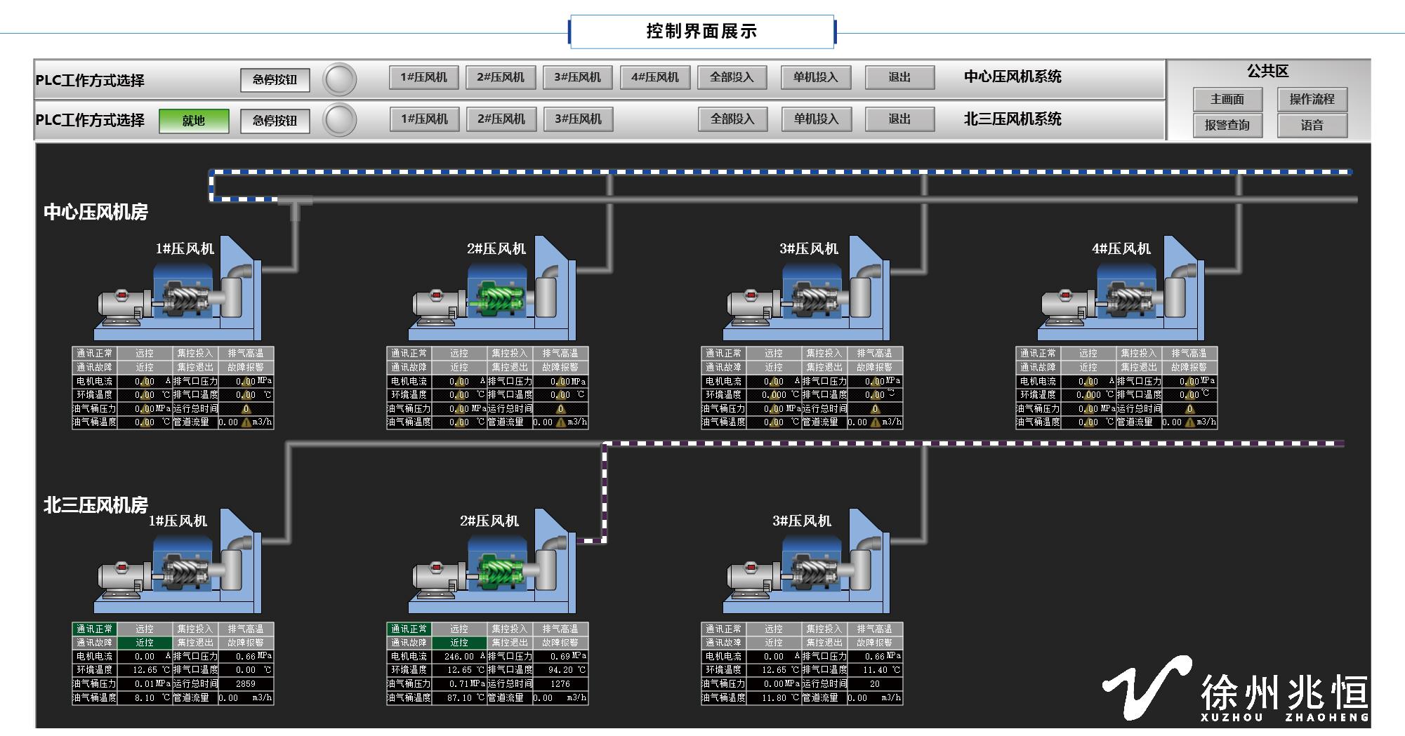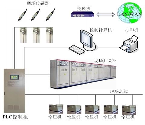 壓風(fēng)機(jī)能否安全、可靠、高效的運(yùn)行,涉及到整個(gè)礦井安全生產(chǎn)和經(jīng)濟(jì)效益。目前,我國煤礦壓風(fēng)機(jī)系統(tǒng)主要采用人員值守、定期巡視、定期檢修、定期切換風(fēng)機(jī)的方式,這種方式無法及時(shí)發(fā)現(xiàn)壓風(fēng)機(jī)系統(tǒng)潛在的危險(xiǎn),甚至出現(xiàn)緊急情況下不能及時(shí)送風(fēng)、壓風(fēng)機(jī)帶病運(yùn)行現(xiàn)象。我公司根據(jù)生產(chǎn)過程中的實(shí)際需求,運(yùn)用計(jì)算機(jī)監(jiān)測(cè)和PLC技術(shù),研發(fā)了一套地面壓風(fēng)機(jī)遠(yuǎn)程監(jiān)控系統(tǒng)。